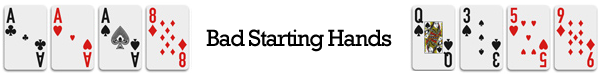 Bad Starting Hands: Now that we know the good hands let’s take a look at the bad hands in Omaha that you absolutely want to avoid at all costs since they have a very slim chance of winning hands. Some of the worst hands in Omaha games include trips, for example Ace, Ace, Ace, 2 & completed related cards like 10, 2, 6, Queen. The reason these hands suck is because it makes it really hard to beat other draws & get a winning hand since your options are so limited in what kind of hand you can make against the board.
